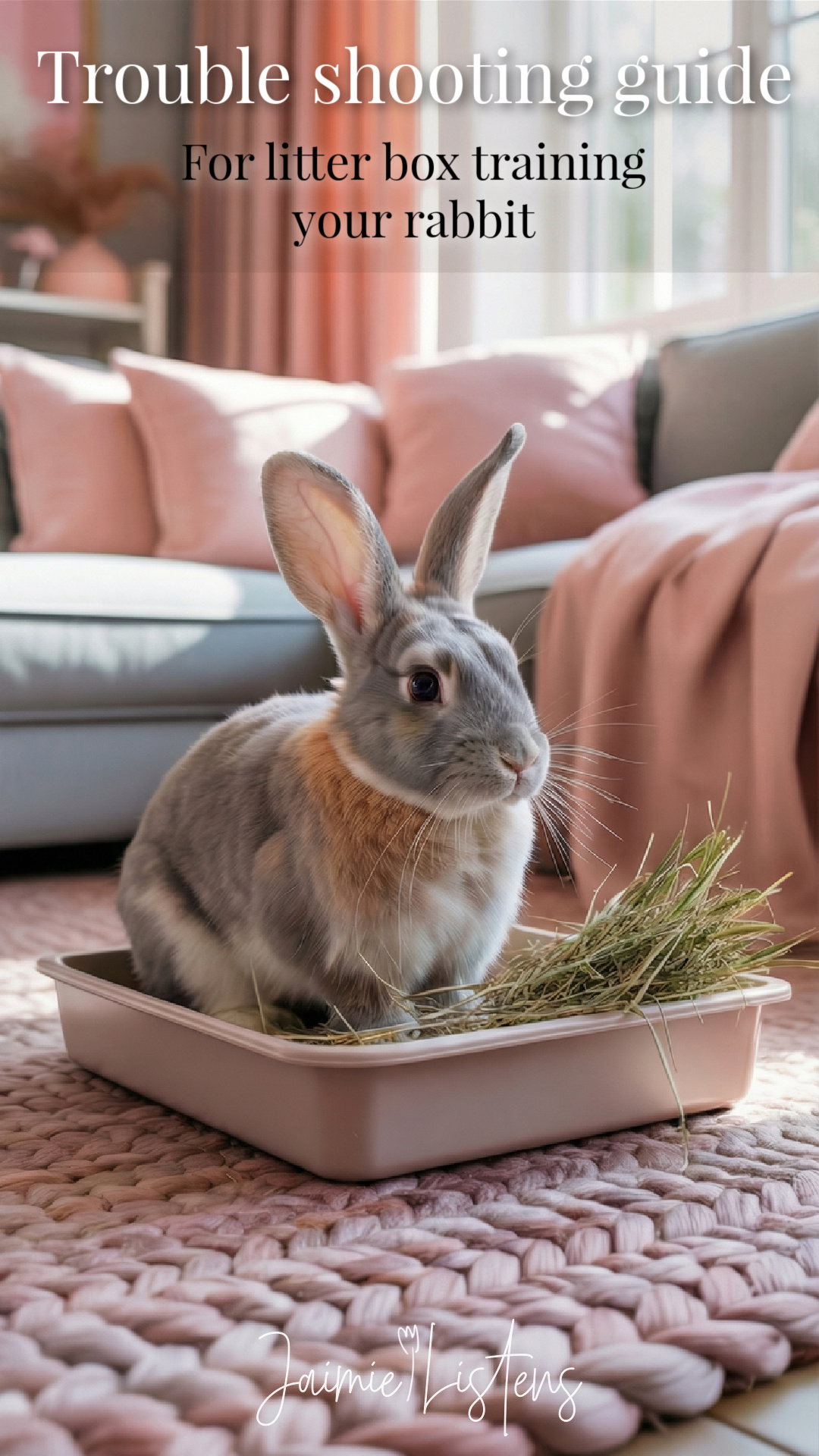 A rabbit sitting in a litter tray with hay on a pink textured rug in a living room. Text overlay says it’s a troubleshooting guide for litter box training your rabbit.